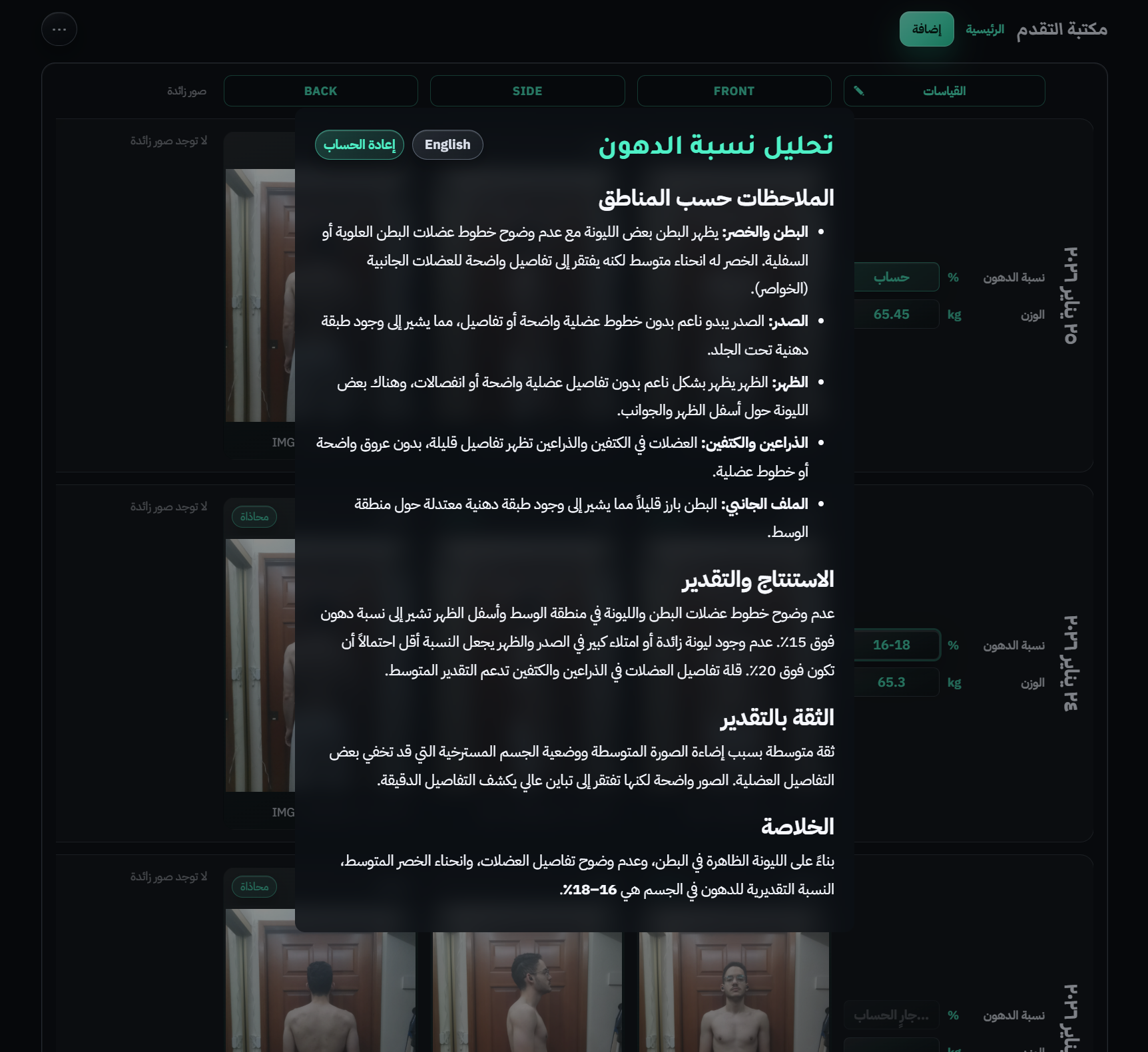 فرق يشرحلك المرحلة اللي انت فيها ويعطيك تحليل مفصل لنسبة الدهون في جسمك. افهم تكوين جسمك وتابع كيف يتغير مع الوقت.
